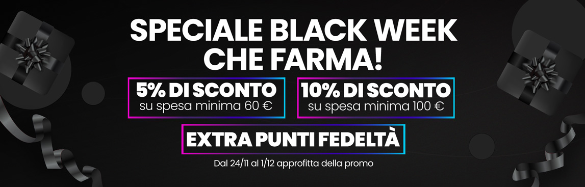 La Black Week di CheFarma è iniziata, con offerte imperdibili valide dal 24 novembre al 1 dicembre. Durante questo periodo puoi ottenere 5% di sconto sugli ordini a partire da 60€ e 10% di sconto sugli ordini da 100€. Inoltre, ogni acquisto ti permette di accumulare extra punti fedeltà, così risparmi ancora di più sui tuoi prossimi ordini.