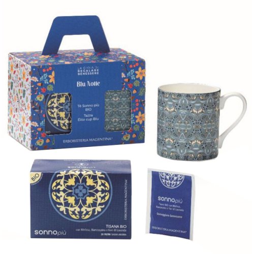 Tazza + Tisana SonnoPiù: integratore alimentare a base di melissa e biancospino utili per favorire il rilassamento e il benessere mentale. Tiglio indicato per un fisiologico sonno e in caso di stress e Lavanda.
