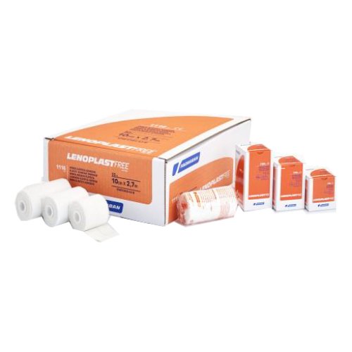 Benda adesiva elastica longitudinalmente senza lattice o resine naturali. La sua estensibilità è dovuta alla speciale concatenazione del tessuto, altamente resistente nel senso dell’ordito/longitudinale. Presenta bordi che impediscono lo sfilacciamento, eliminando potenziali lacci di costrizione sulla estremità su cui viene applicato il bendaggio. Tessuto bianco con linea centrale gialla per facilitare l’applicazione. Adesivo di caucciù sintetico e ossido di zinco con elevata forza adesiva alla cute. Nella formulazione dell’adesivo non si utilizza nè lattice, nè caucciù naturale inoltre l’adesivo non presenta le proteine tipiche del caucciù naturale e delle resine, responsabili delle allergie, tipiche dei prodotti con lattice. L’adesivo è disposto sul tessuto sotto forma di sottile strato uniforme poroso che consente la traspirazione, impedendo così la macerazione della cute. Presenta margini liberi dall’adesivo al fine di evitare lesioni alla cute per bendaggi applicati per lunghi periodi di trattamenti. Lenoplast Free presenta un canotto arrotondato con un diametro di 18 mm., che facilita l'applicazione della benda evitando di provocare tagli alle mani del personale sanitario.