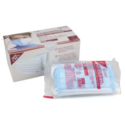 Mascherina bambino di tipo II, triplo strato di TNT. Strato interno in TNT di polipropilene traspirante e banda nasale in alluminio plastificato.