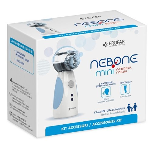 Il kit accessori per NEBONE MINI aerosol mesh è progettato per essere utilizzato come parte di ricambio del NEBONE MINI aerosol mesh modello LT-N100, un dispositivo medico per la nebulizzazione di soluzioni per inalazione prescritte dal medico a pazienti adulti e pediatrici di età superiore a 2 anni. Il kit è costituito da 1 mascherina per adulti, 1 mascherina pediatrica e 1 boccaglio. Ogni accessorio è progettato per essere monouso. Per le indicazioni mediche fare riferimento alle istruzioni fornite con il NEBONE MINI aerosol mesh.