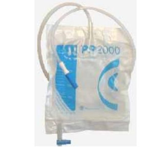 sacca raccogli urina a circuito chiuso. Con valvola antireflusso e rubinetto di scarico. Dotato di foro di prelievo.