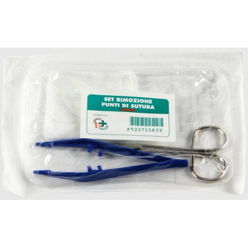 1 forbice in metallo, 1 pinzetta in plastica, 2 compresse in garza di cotone cm 7.5 x 7.5 8 strati.